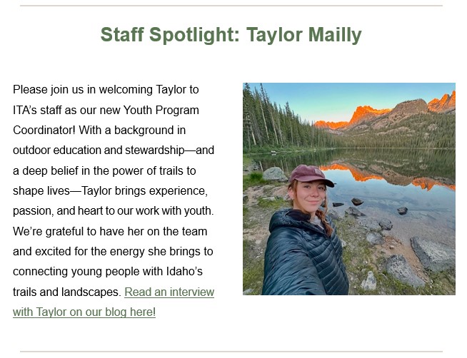 The Idaho Trails Association (ITA) was founded in 2010 and predominantly works on backcountry trails throughout Idaho. However, they’ve also recently expanded into the “front-country” of the Boise foothills and trails adjacent to cities including Pocatello, Sandpoint, and Coeur d’Alene.