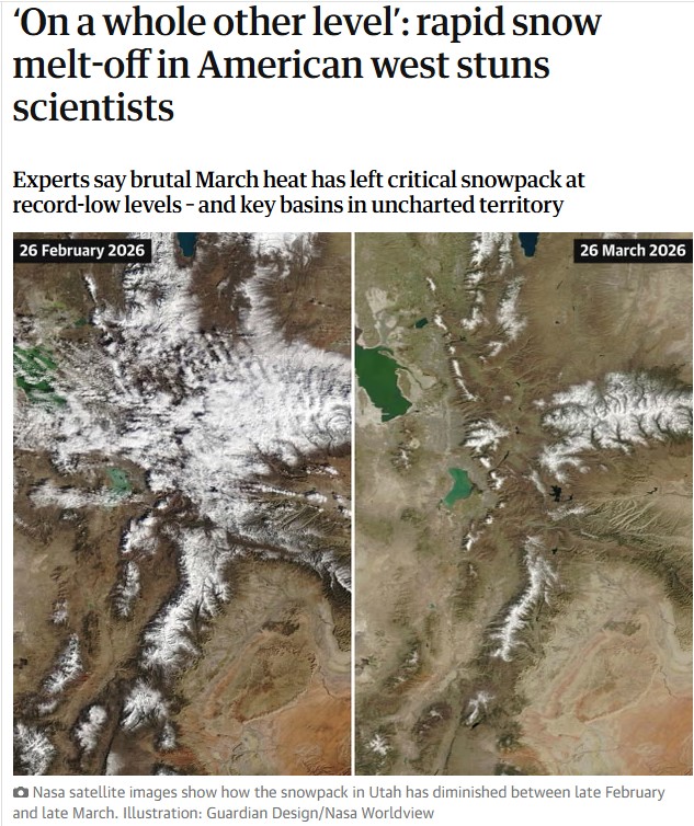 Snow surveys taking place across the American west this week are offering a grim prognosis, after a historically warm winter and searing March temperatures left the critical snowpack at record-low levels across the region.